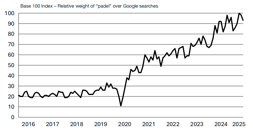 Мировой рост популярности паделя ускоряется благодаря растущему интересу общественности, быстрому развитию инфраструктуры и расширению региональных возможностей . Данные Google Trends показывают, что количество поисковых запросов по слову «падл» в мире продолжает стабильно расти с 2016 года , что отражает резкий рост осведомлённости и интереса к игре. Источник: Google Trends, Стратегия и анализ
