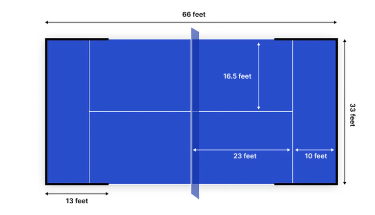 Полноценный корт для игры в падель имеет длину 20 метров и ширину 10 метров (примерно 66 футов на 33 фута). Игровая площадка имеет прямоугольную форму и разделена пополам сеткой, как в теннисе.