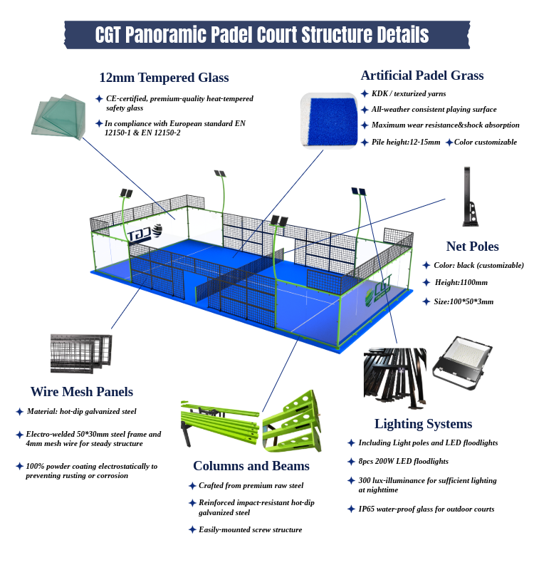 В CGT мы специализируемся на панорамных системах для падел-кортов и предлагаем комплексные решения — от предпродажных консультаций и разработки чертежей до поставки аксессуаров, руководства по установке и послепродажного обслуживания. Благодаря международному опыту мы помогаем спортивным сооружениям уверенно внедрять падел-теннис на своих площадках, обеспечивая лёгкость и надёжность.